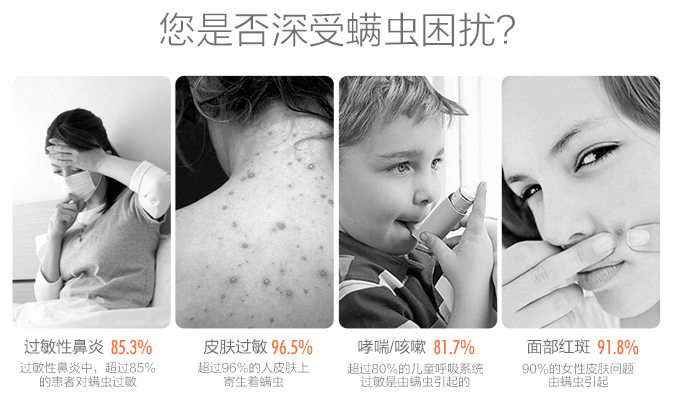 螨蟲是一種肉眼不易看見的微型害蟲,種類很多,目前發(fā)現(xiàn)在居室內(nèi)生活的螨蟲有40余種,其中與人體健康有關(guān)的有十多種。最常見的有塵螨、粉螨、蠕螨、疥螨等。調(diào)查表明,成年人約有97%感染螨蟲,其中以塵螨為主。塵螨的尸體、分泌物和排泄物都是可致病的過敏原。它們分布在地毯、沙發(fā)、毛絨玩具、被褥、坐墊、床墊和枕芯等處孳生,以人的汗液、分泌物、脫落的皮屑為食,繁殖速度極快。其次還有:粉螨,主要在貯存的食品和糧食中繁殖;蠕螨,主要寄生在人的毛囊和皮脂腺中,如鼻、耳、頭皮、前胸、后背、耳道等地方;疥螨,寄生于人和哺乳動(dòng)物的皮膚表層。值得一提的是,越來越多的家庭飼養(yǎng)寵物,極易導(dǎo)致疥螨通過衣褲、被褥直接傳播給人,甚至造成人與人之間的相互傳播。